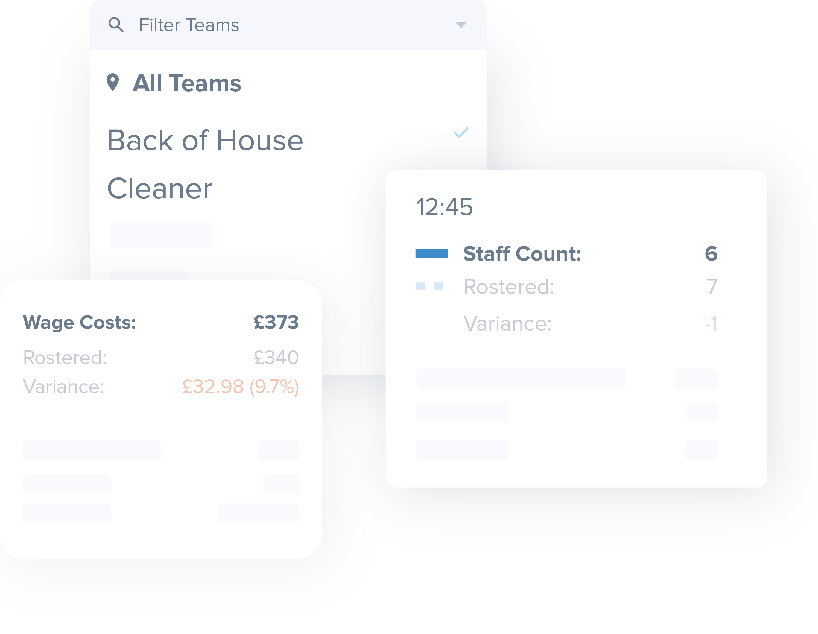 Get complete oversight of staff numbers in all teams and at all locations. See how many staff are currently working, and which teams or locations have the largest variance from your shift schedules.